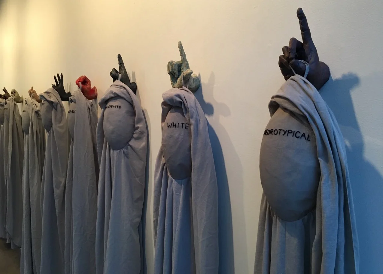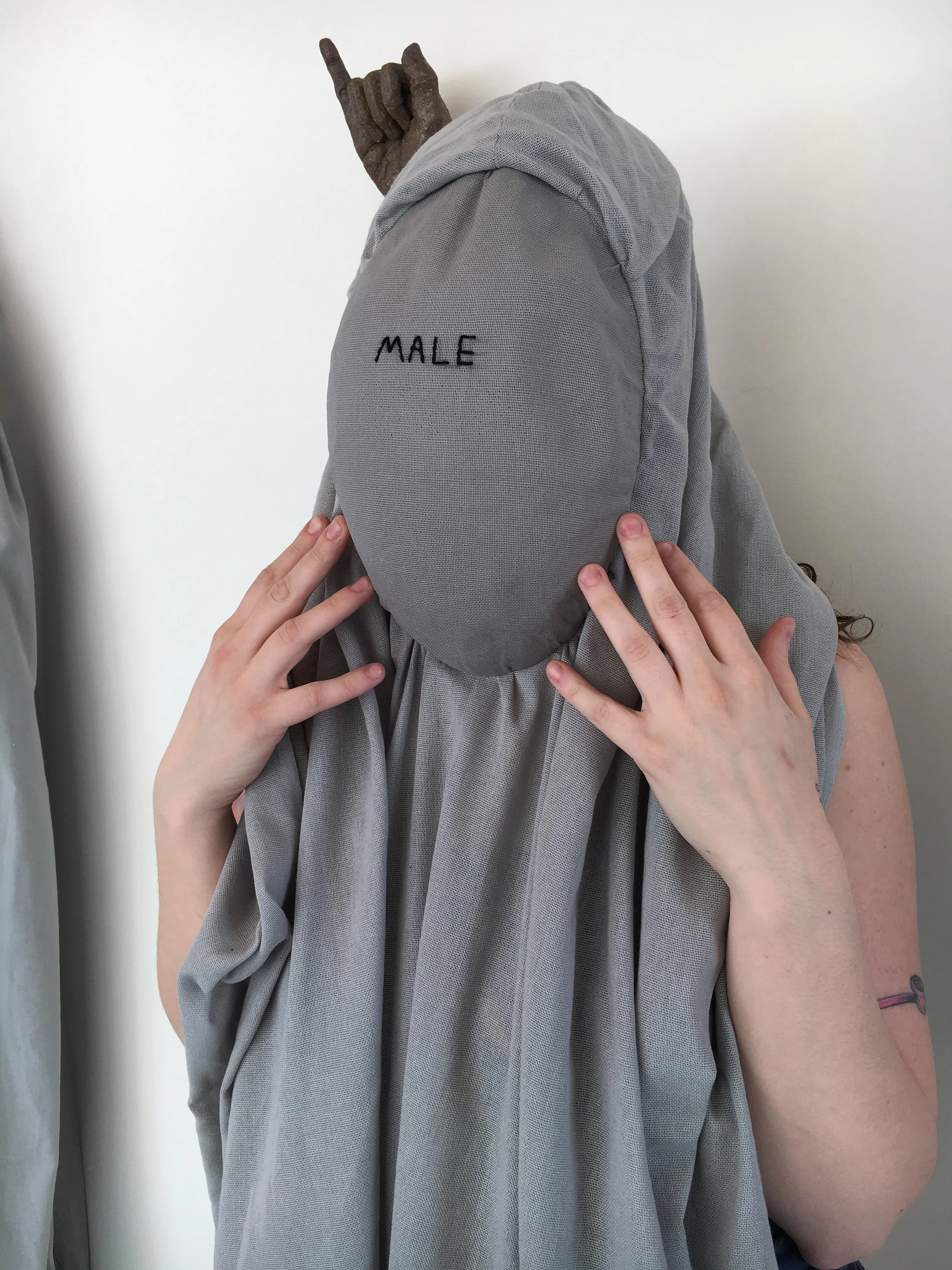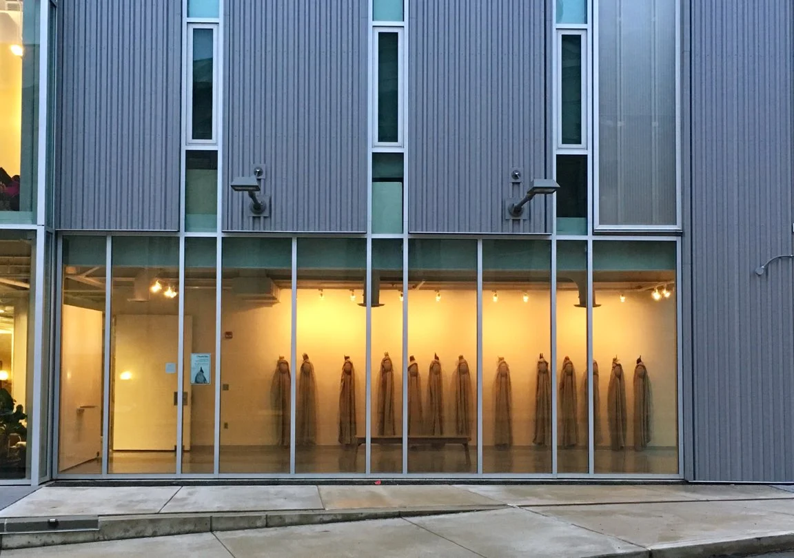 This collaborative exhibit draws from Ames’ background in figurative ceramic sculpture, Sherrard’s background in conceptual art, and both of their experimentations with textile work in order to reimagine this vocabulary of privileges as an ominous crowd of spectral figures or mask-shrouds. Each can be lifted from the wall and donned over the viewer’s faces, temporarily rendering our individual selves invisible and affording us a moment of release from identity hyper-vigilance. A notebook inscribed with the phrase, “If I were ___ I would” invites us to reflect on and record that moment of ‘freedom’.
