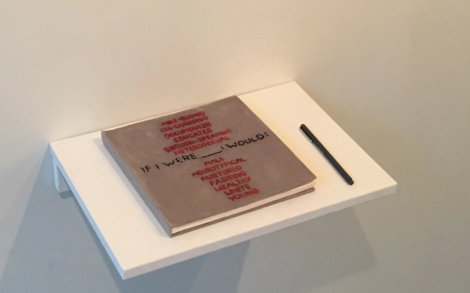 There are two books, equal in size and color, positioned on either side of the gallery—and while one of them offers us the opportunity to explore the absence of such privileges from our lives and how those absences may leave us vulnerable, or longing, the second book is inscribed with just one privilege; the final thing we may long for when in possession of these others: “freedom from accountability.” That book does not open.