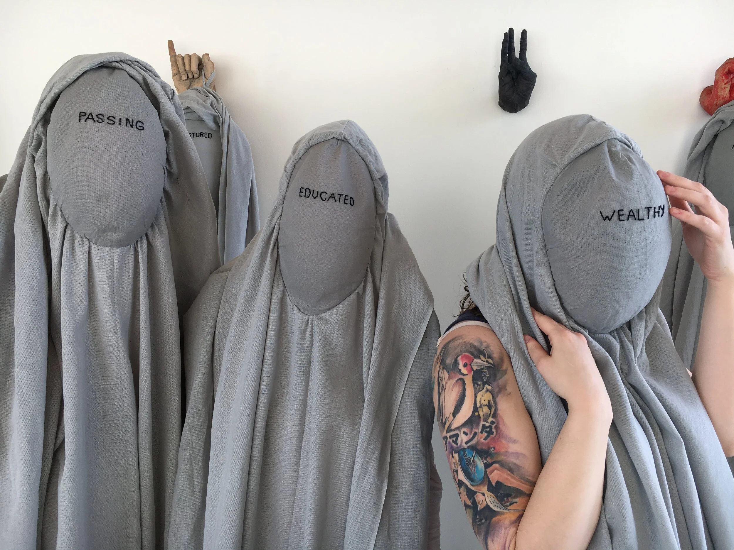 Owing a lot to privilege inventories like the seminal essay Unpacking the Invisible Knapsack by Peggy McIntosh, this exhibit’s engagement with the vocabulary of privileges was a reaction to the brittle and anxious psychological landscape of the post-election. Living in a small city in the midst of a vast red state—one which had overwhelmingly supported a sexual predator for office and the white-supremacist, anti-immigrant, homophobic, and ableist ideologies associated with him—it seemed impossible to avoid the heightened sense of being visible for all those traits that could so easily draw hatred or violence from the people around us. This produced a kind of longing for some form of invisibility, or psychological safe passage, while simultaneously throwing into sharp relief the ways in which we were each already masked within certain privileges or apparent privileges. In this heightened landscape, the ways in which we seemed safe (For Ames, the lack of visual traces from certain experiences that amplified her sense of vulnerability as a woman; for Sherrard, the light skin that masked her African heritage, the gender presentation that masked her queerness, and the education and accent that masked her history as an immigrant) became almost as heavy and frightening as the ways in which we weren’t.